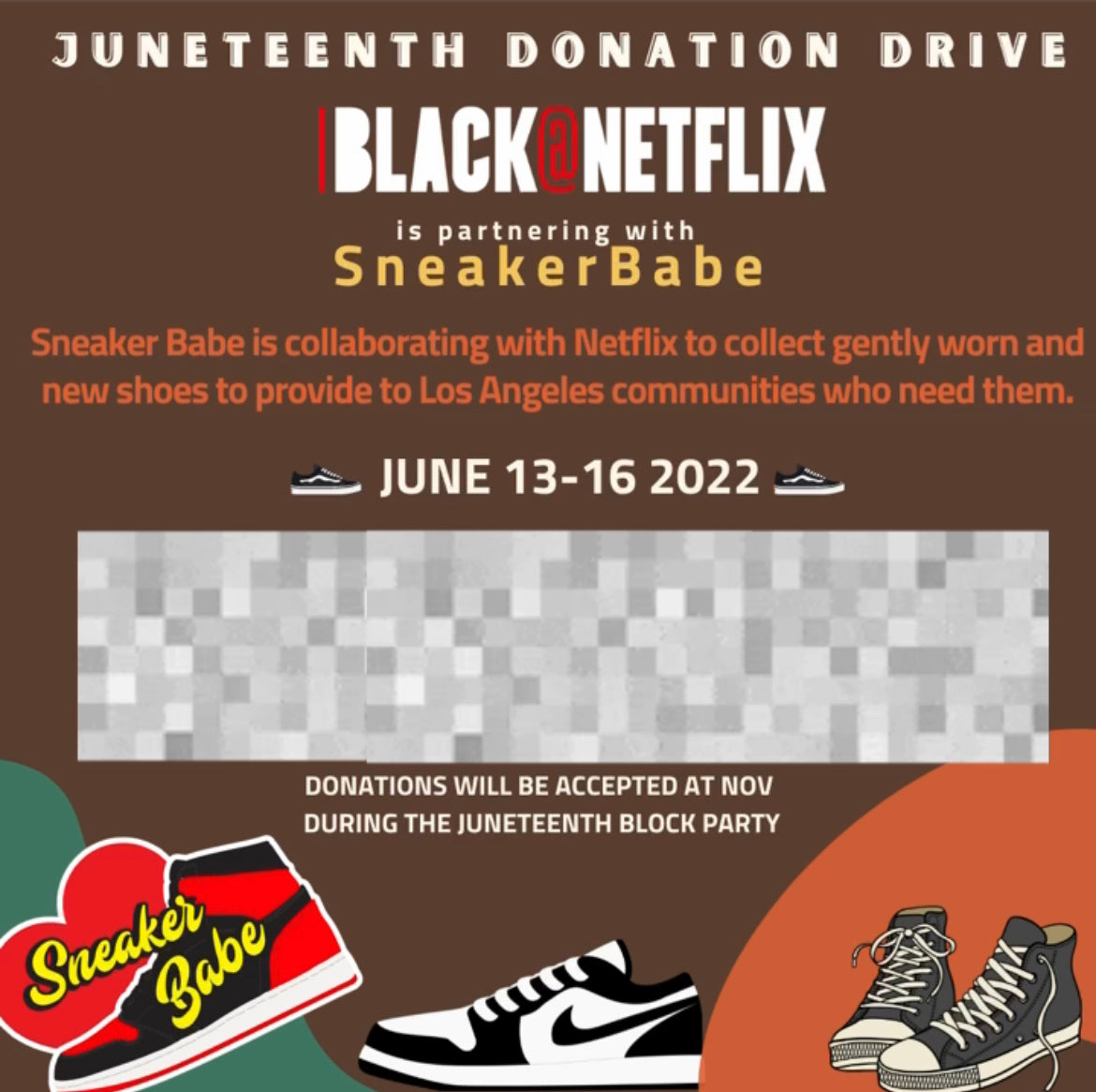 In Celebration of Juneteenth , Sneaker Babe had the opportunity to collaborate with Netflix in their very first corporate partnership to collect gently worn and new shoes to provide to Los Angeles communities who need them.